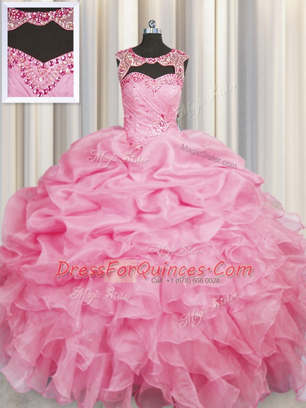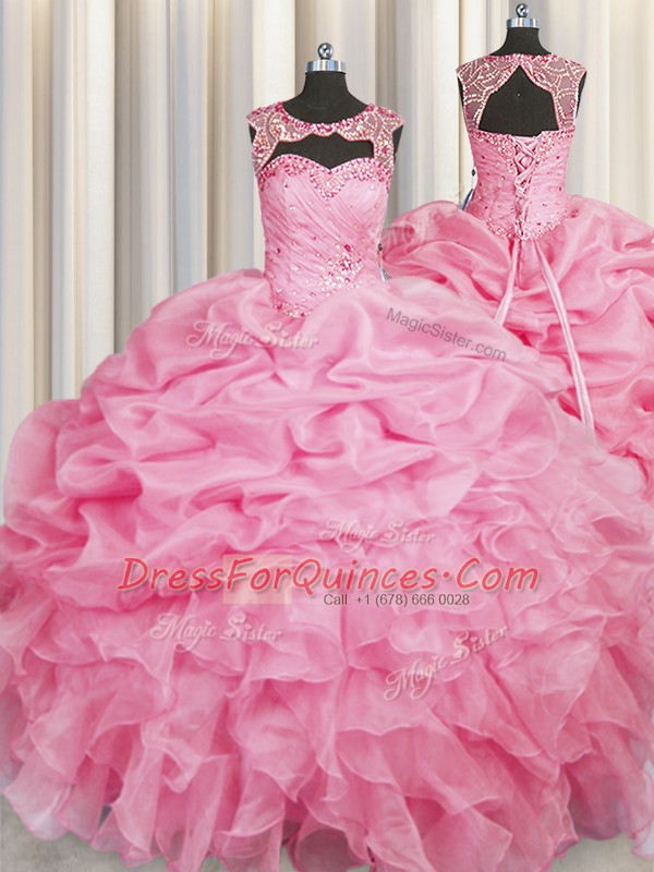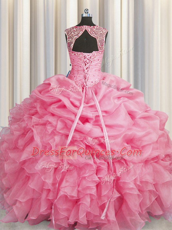Modest Scoop Rose Pink Organza Lace Up Ball Gown Prom Dress Sleeveless Floor Length Beading and Pick Ups