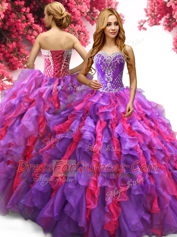 Multi-color Ball Gowns Sweetheart Sleeveless Organza Floor Length Lace Up Beading and Ruffles Quinceanera Gowns