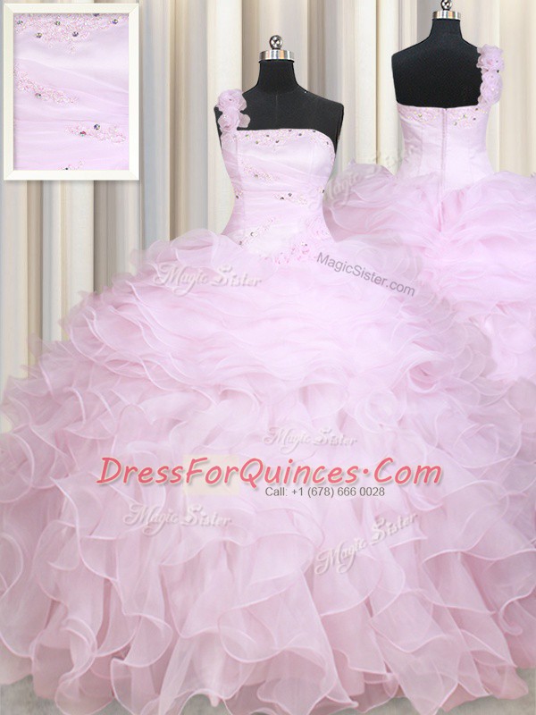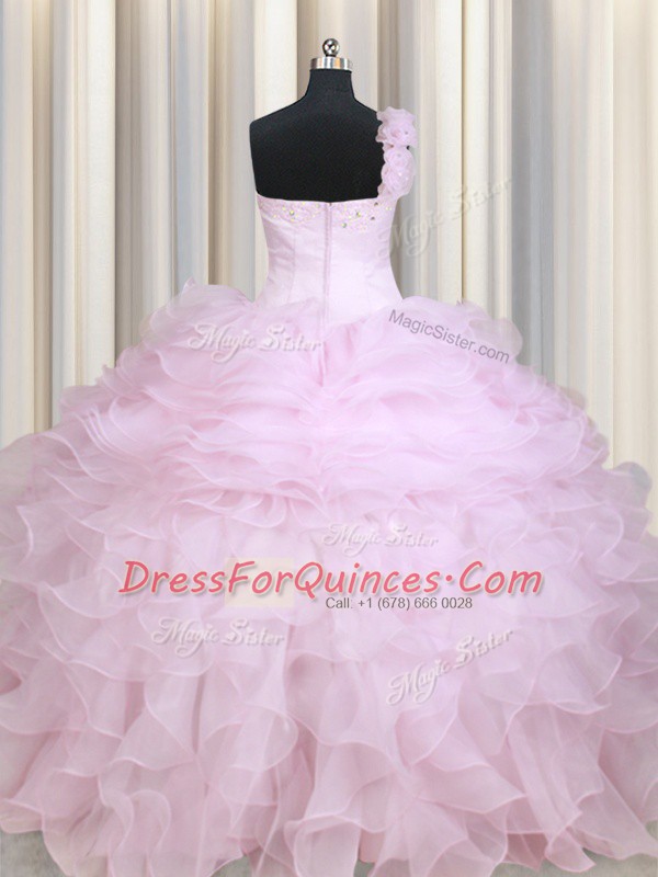 One Shoulder Baby Pink Sleeveless Floor Length Beading and Ruffles Zipper Quinceanera Dresses