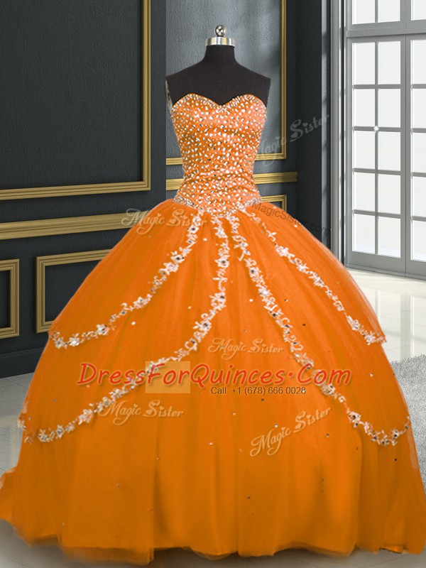 Orange Sleeveless Tulle Brush Train Lace Up Quinceanera Gowns for Military Ball and Sweet 16 and Quinceanera
