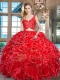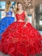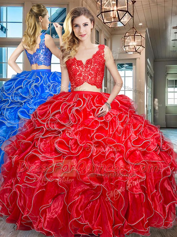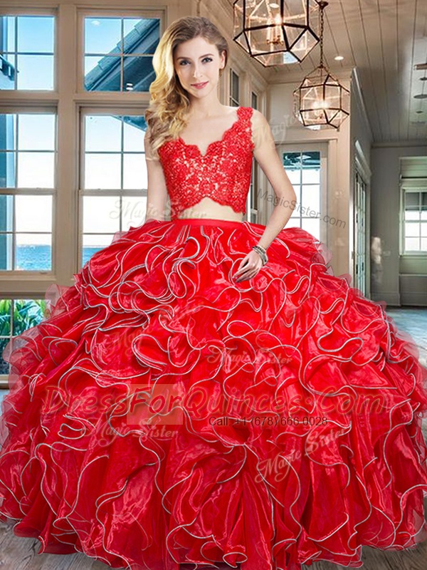 Red Quinceanera Dresses Military Ball and Sweet 16 and Quinceanera and For with Lace and Ruffles V-neck Sleeveless Zipper