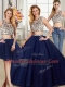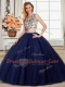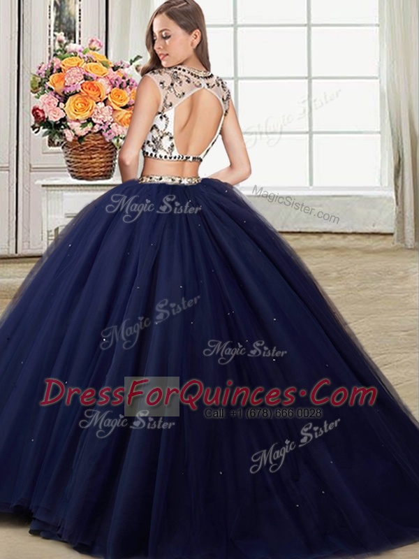 Romantic Three Piece With Train Navy Blue Sweet 16 Quinceanera Dress Scoop Cap Sleeves Brush Train Backless