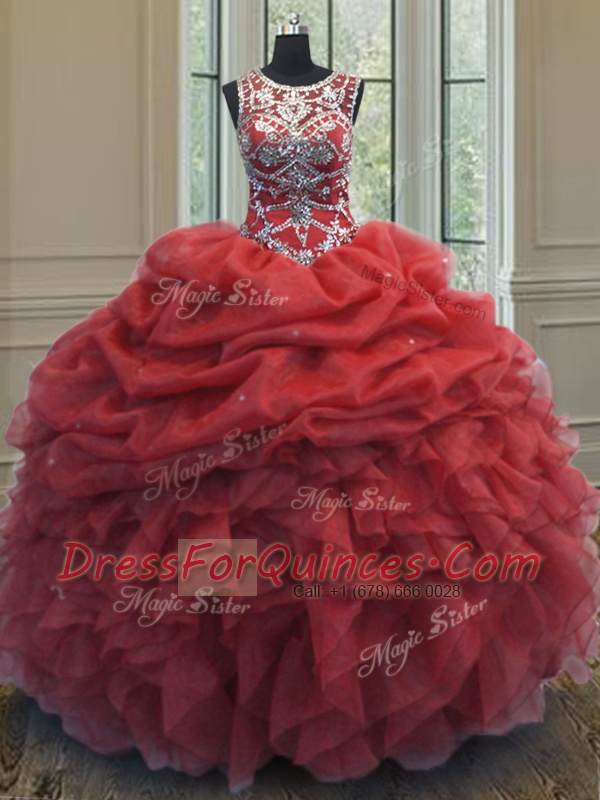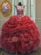 Scoop Coral Red Lace Up Quince Ball Gowns Beading and Ruffles and Pick Ups Sleeveless Floor Length