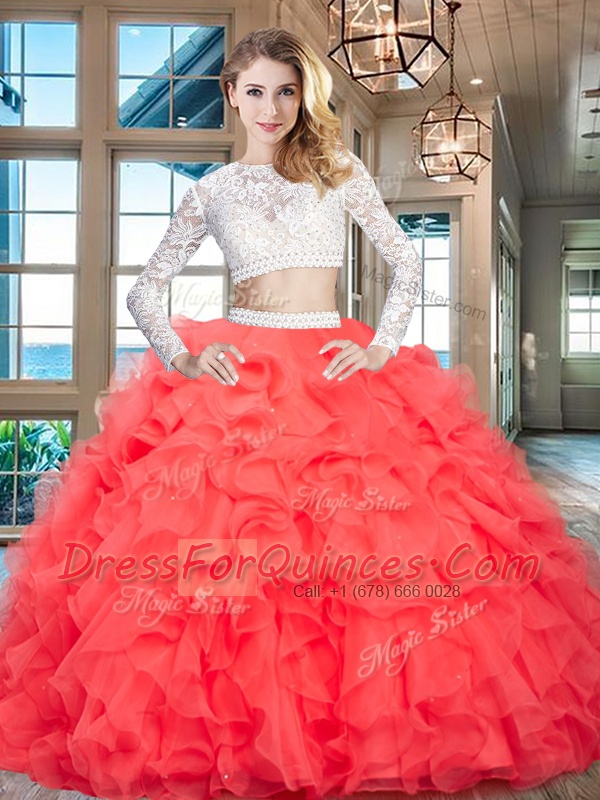 Scoop Long Sleeves Floor Length Beading and Lace and Ruffles Zipper 15th Birthday Dress with Red