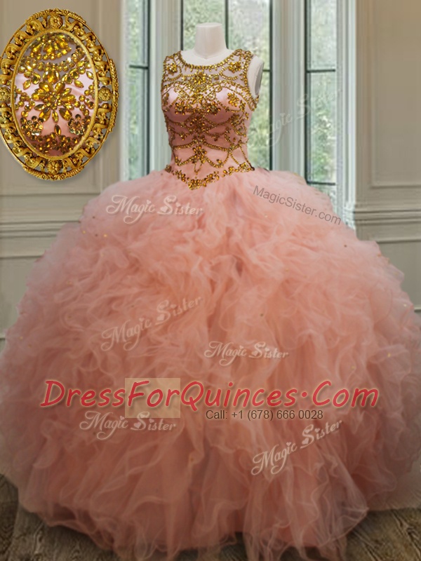 See Through Scoop Sleeveless Tulle Ball Gown Prom Dress Beading and Ruffles Lace Up