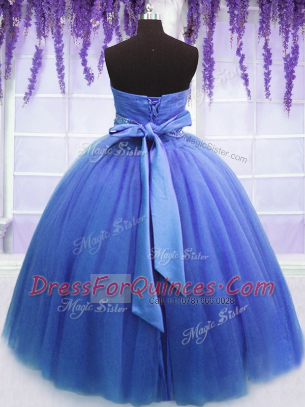 Simple Blue Ball Gowns Sweetheart Sleeveless Tulle Floor Length Lace Up Beading and Belt Sweet 16 Quinceanera Dress