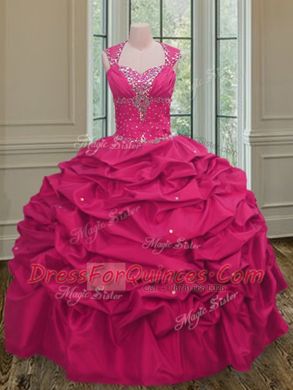 Straps Sleeveless Quinceanera Gown Floor Length Beading and Pick Ups Hot Pink Taffeta