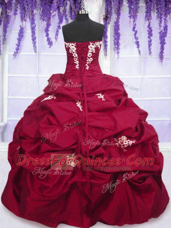 Taffeta Strapless Sleeveless Lace Up Appliques and Pick Ups Quinceanera Gown in Fuchsia