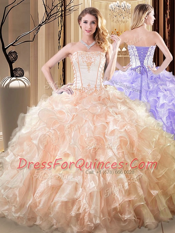 Yellow Lace Up Strapless Embroidery and Ruffles Vestidos de Quinceanera Organza Sleeveless