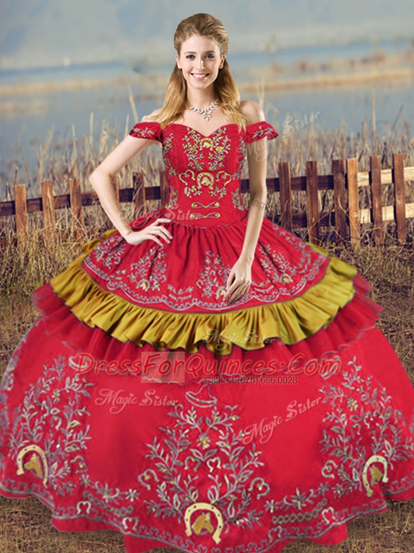 Beautiful Satin and Organza Off The Shoulder Sleeveless Lace Up Embroidery 15 Quinceanera Dress in Red