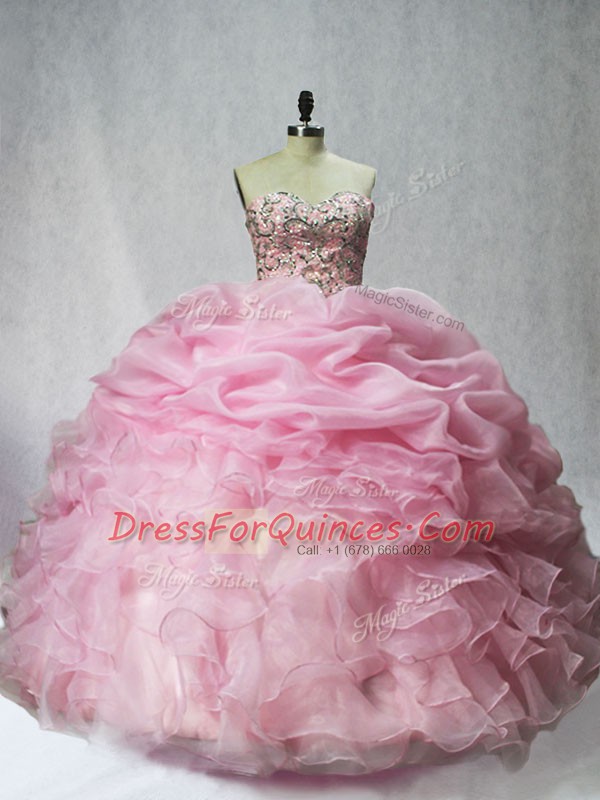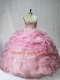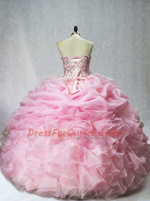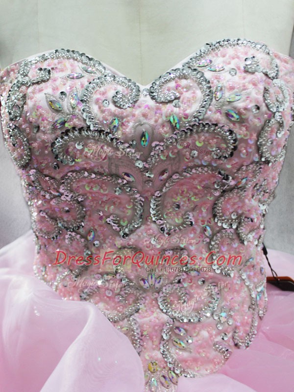 Cute Organza Sweetheart Sleeveless Lace Up Beading and Ruffles and Pick Ups Quinceanera Gown in Baby Pink