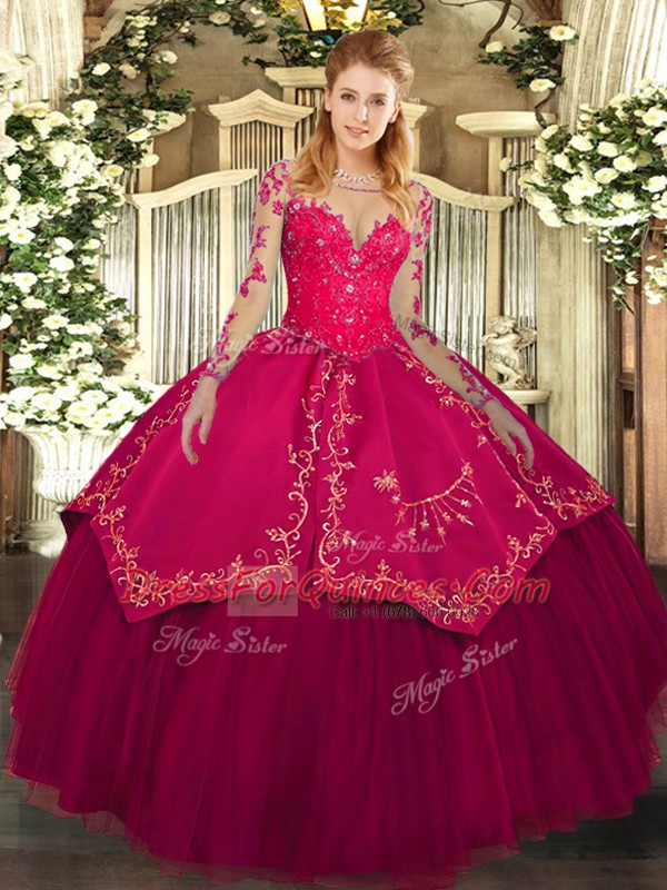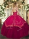 Dramatic Scoop Long Sleeves Vestidos de Quinceanera Floor Length Lace and Embroidery Wine Red Organza and Taffeta