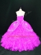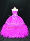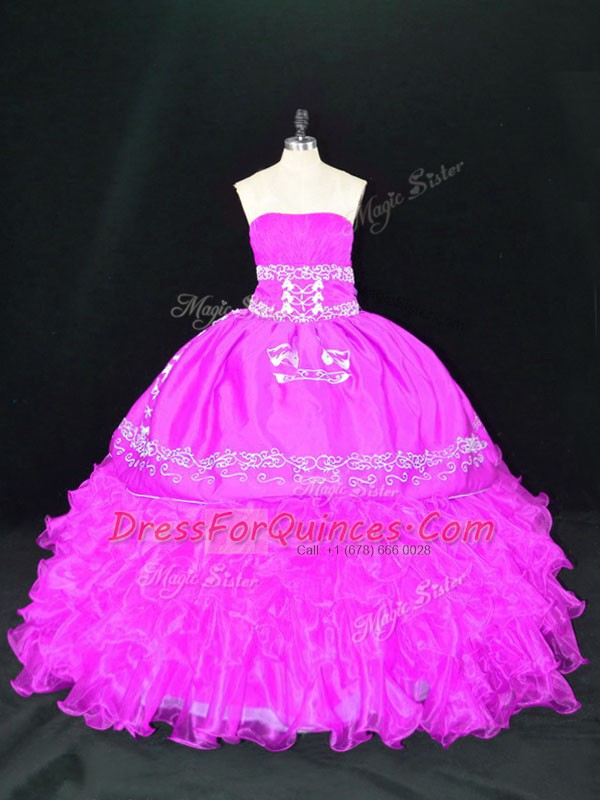 Elegant Fuchsia Organza Lace Up Strapless Sleeveless Floor Length Quinceanera Gowns Embroidery and Ruffles