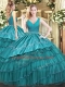 Floor Length Teal Quinceanera Gowns Satin and Organza Sleeveless Embroidery and Ruffled Layers