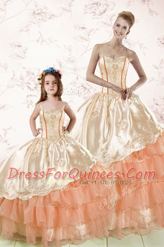 Glorious Peach Lace Up 15th Birthday Dress Embroidery and Ruffled Layers Sleeveless Floor Length