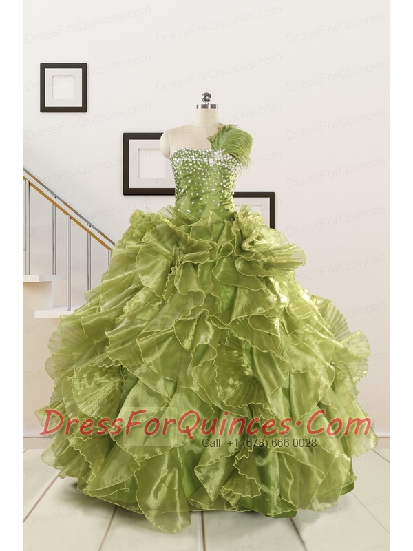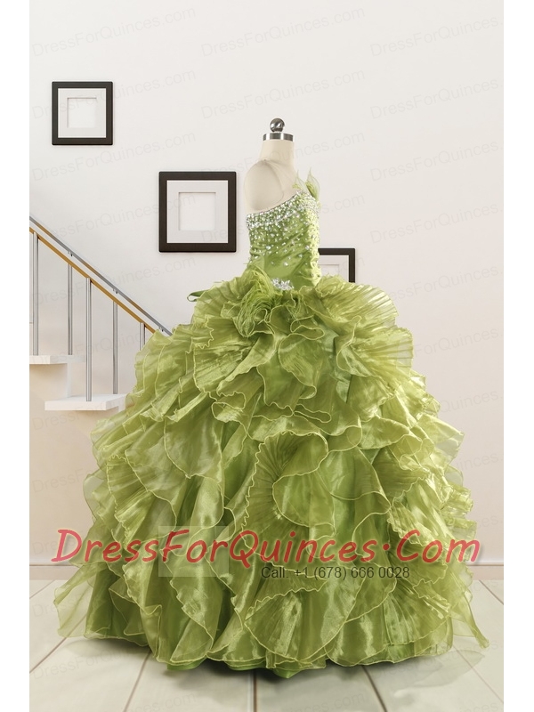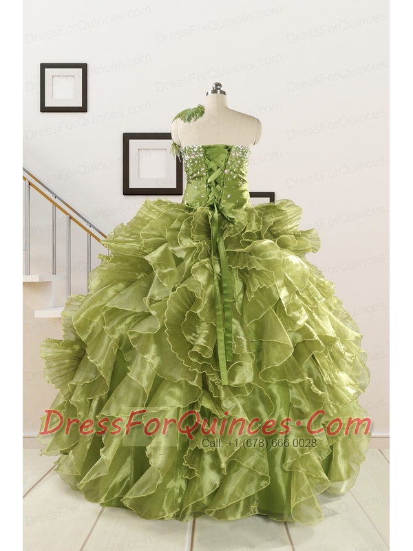 Inexpensive Olive Green Dresses for Quince with Beading and Ruffles