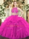 Luxurious Scoop Sleeveless Quinceanera Gown Floor Length Beading and Ruffles Fuchsia Tulle