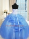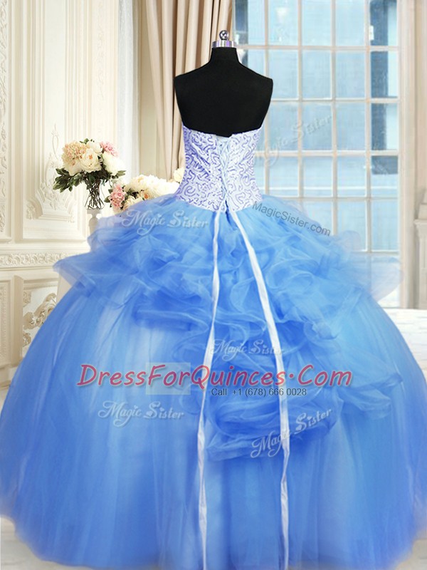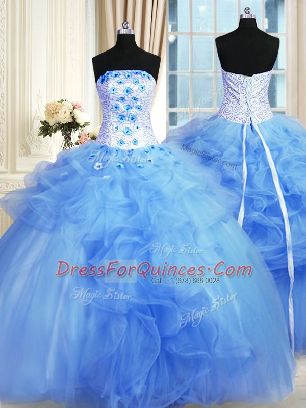 Luxury Blue Ball Gowns Pick Ups and Hand Made Flower Sweet 16 Dresses Lace Up Tulle Sleeveless Floor Length