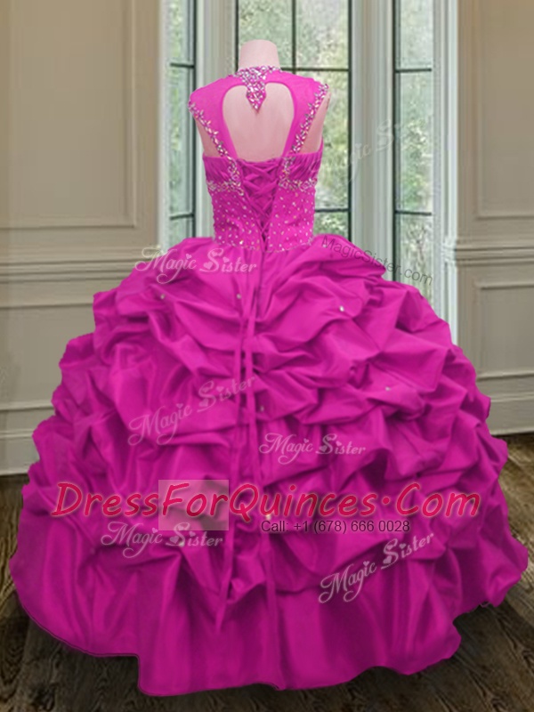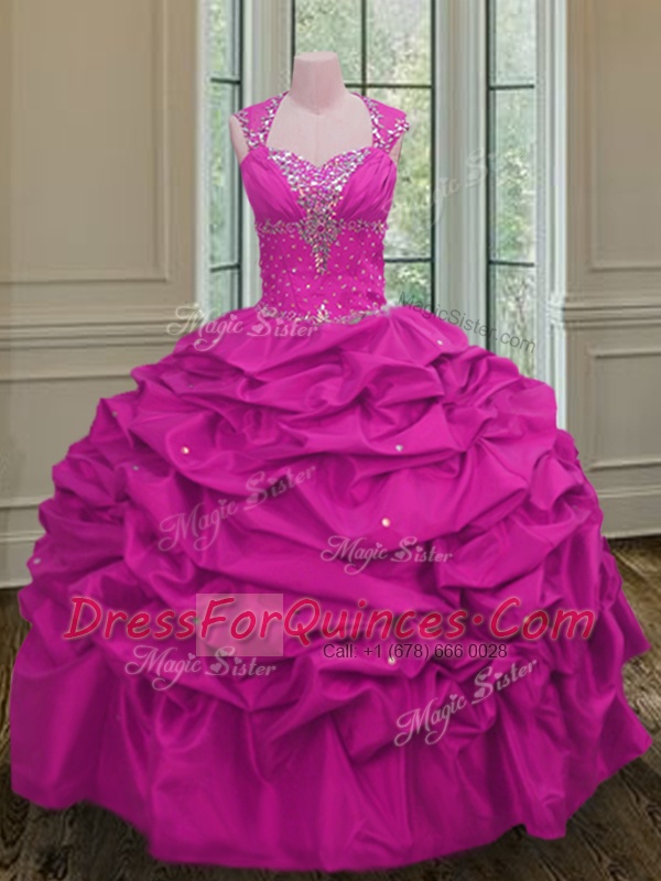 Modest Straps Pick Ups Floor Length Ball Gowns Cap Sleeves Fuchsia Sweet 16 Quinceanera Dress Lace Up