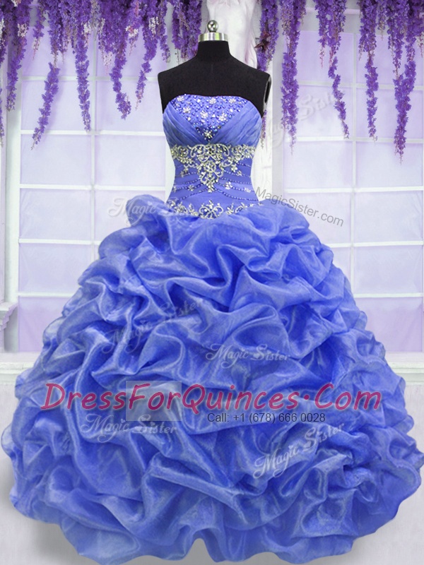 New Style Blue Organza Lace Up Strapless Sleeveless Floor Length Sweet 16 Quinceanera Dress Beading and Pick Ups