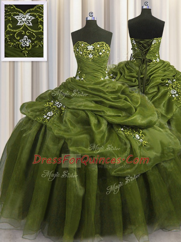 Olive Green Organza Lace Up Sweetheart Sleeveless Floor Length Quinceanera Dresses Beading and Appliques and Pick Ups