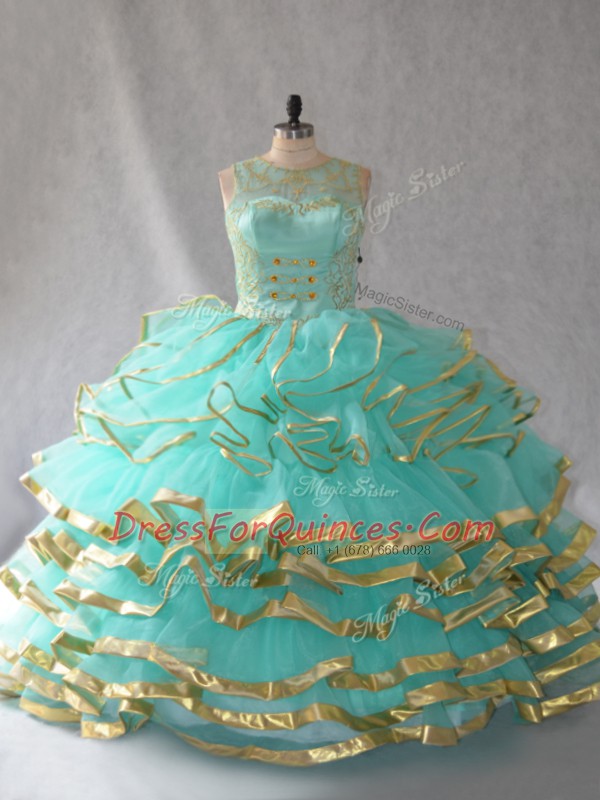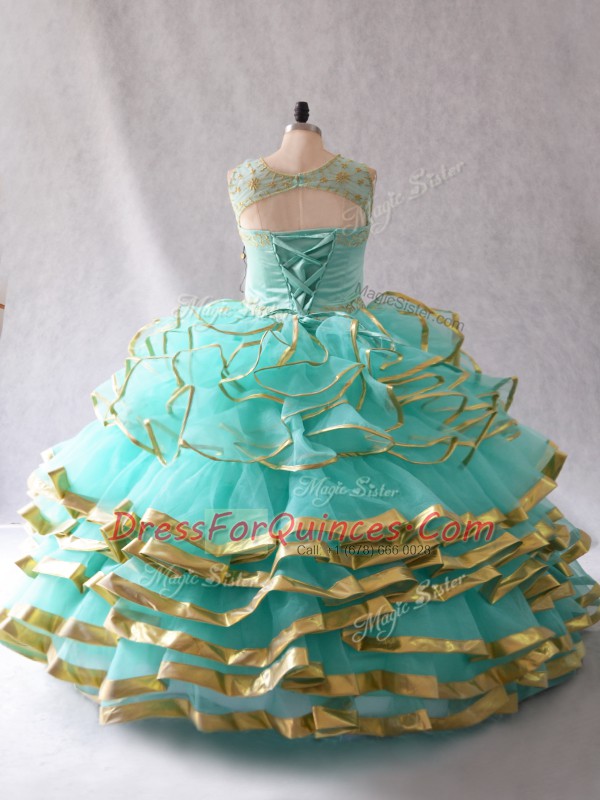 Organza Scoop Sleeveless Lace Up Beading and Embroidery and Ruffles and Ruffled Layers 15th Birthday Dress in Aqua Blue
