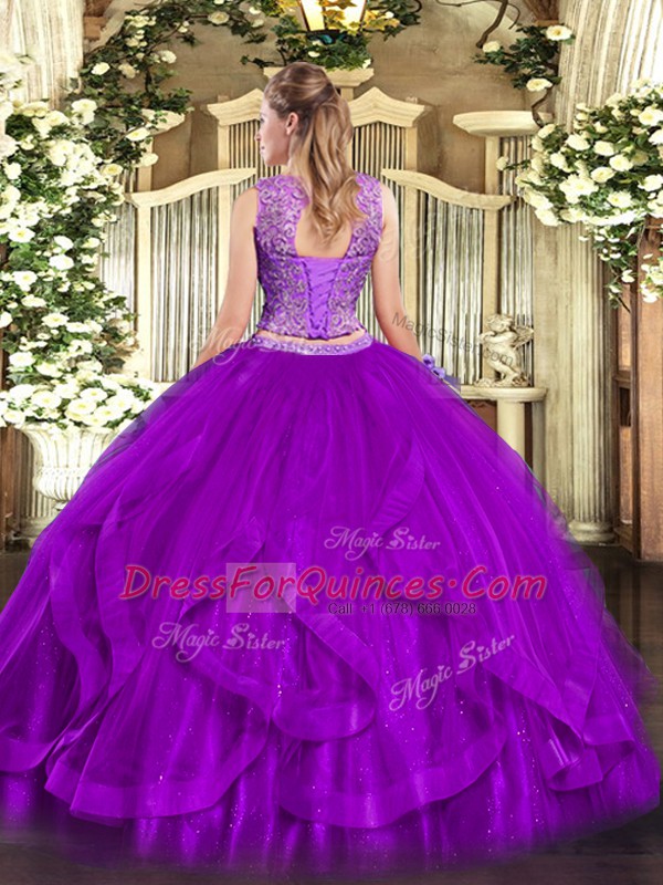 Purple Scoop Neckline Beading and Ruffles 15th Birthday Dress Sleeveless Lace Up