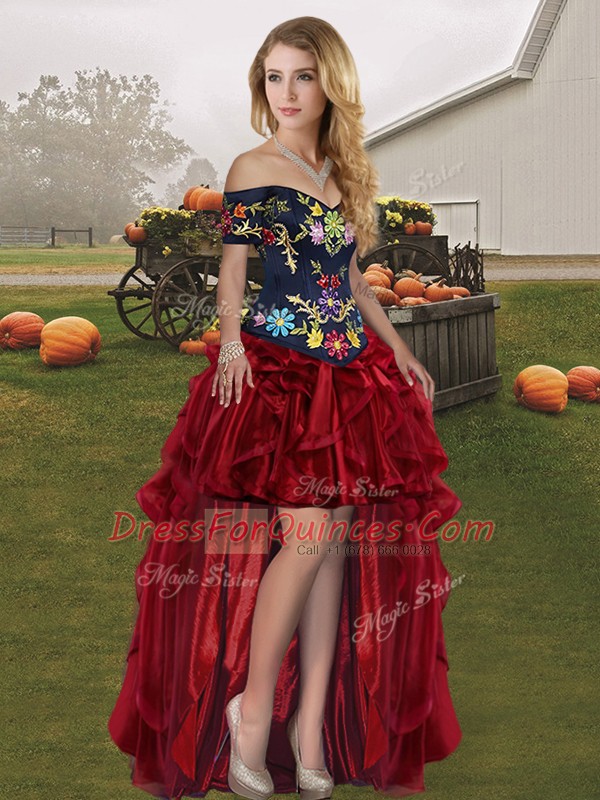 Red And Black Lace Up Off The Shoulder Embroidery and Ruffles 15 Quinceanera Dress Organza Sleeveless
