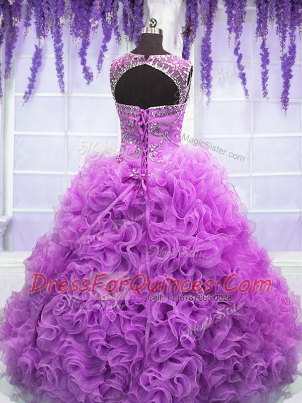 Scoop Sleeveless Quinceanera Dresses Floor Length Beading and Ruffles Lilac Organza