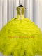 See Through Zipper Up Straps Sleeveless Quinceanera Gown Floor Length Appliques and Ruffles Yellow Organza