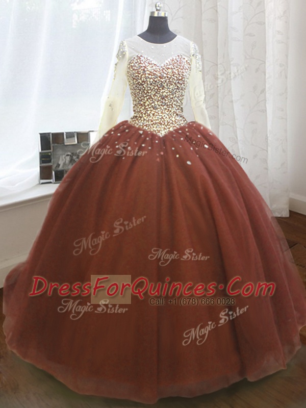 Sequins Scoop Long Sleeves Sweep Train Lace Up Quinceanera Gown Burgundy Organza