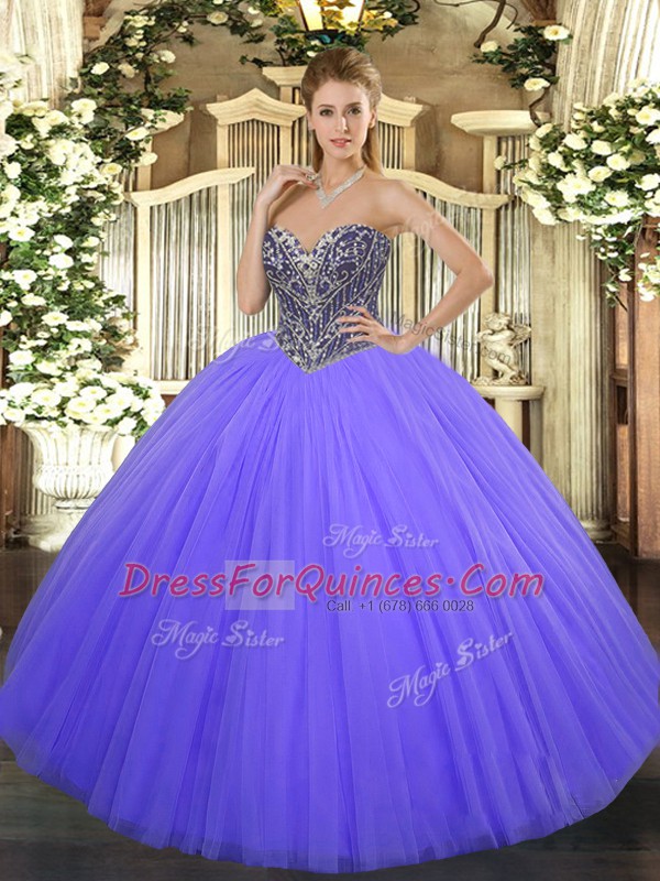 Sexy Floor Length Lace Up Sweet 16 Quinceanera Dress Lavender for Military Ball and Sweet 16 and Quinceanera with Beading
