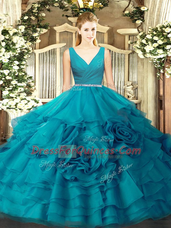 Teal Sleeveless Beading Floor Length Quinceanera Gown