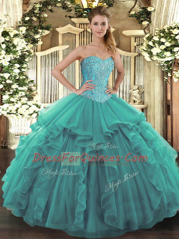 Traditional Turquoise Ball Gowns Tulle Sweetheart Sleeveless Beading and Ruffles Floor Length Lace Up Sweet 16 Dresses