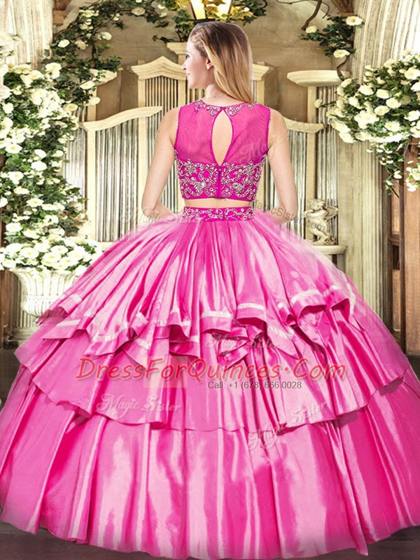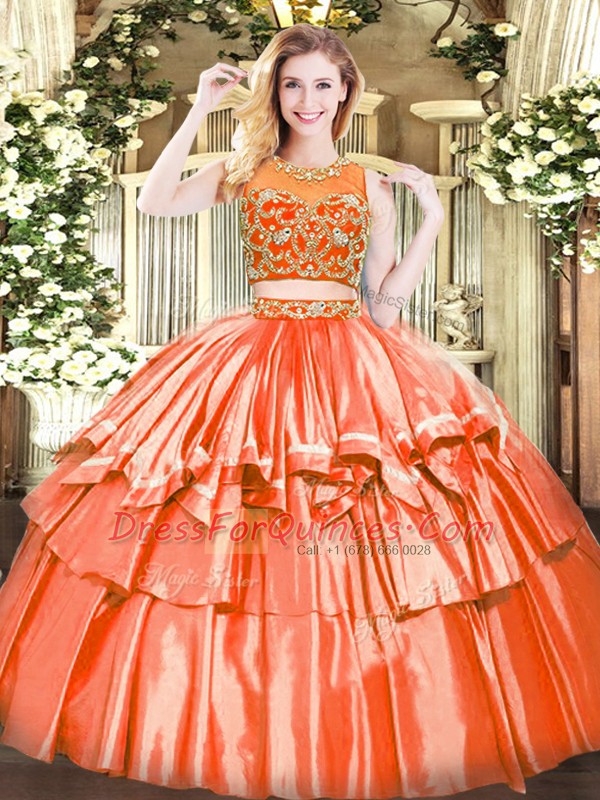 Trendy Orange Red Two Pieces Tulle Scoop Sleeveless Beading and Ruffled Layers Floor Length Zipper 15 Quinceanera Dress