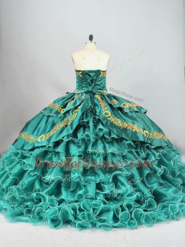 Turquoise Satin and Organza Lace Up Sweetheart Sleeveless Quinceanera Gowns Brush Train Embroidery and Ruffled Layers