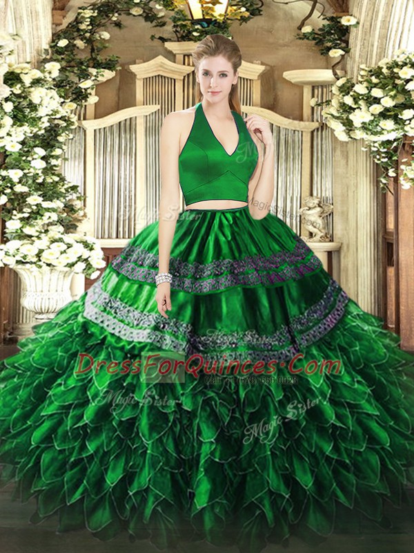 Unique Dark Green Zipper Halter Top Appliques and Ruffles Quinceanera Gown Organza Sleeveless