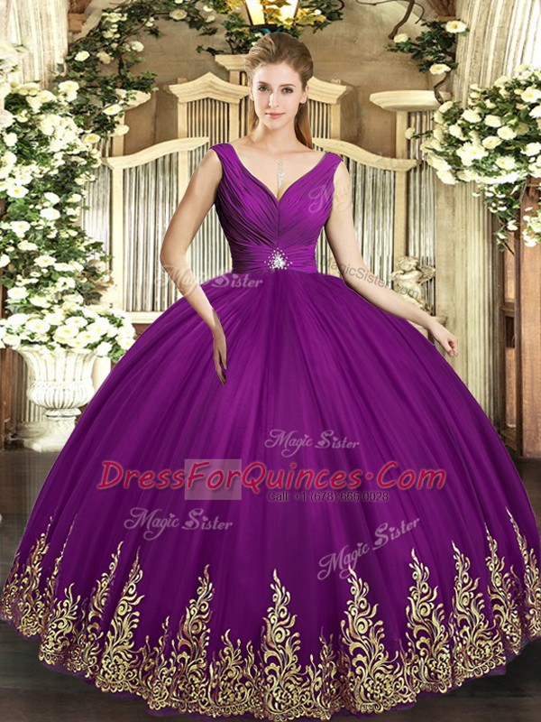 V-neck Sleeveless Sweet 16 Dresses Floor Length Beading and Appliques and Ruching Eggplant Purple Tulle