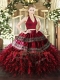 Wine Red Two Pieces Halter Top Sleeveless Organza Floor Length Zipper Appliques and Ruffles Ball Gown Prom Dress