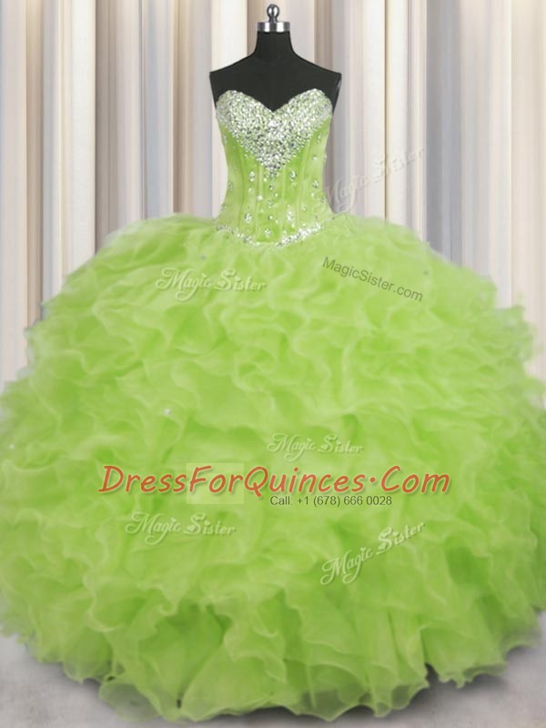 Yellow Green Organza Lace Up 15th Birthday Dress Sleeveless Floor Length Beading and Ruffles