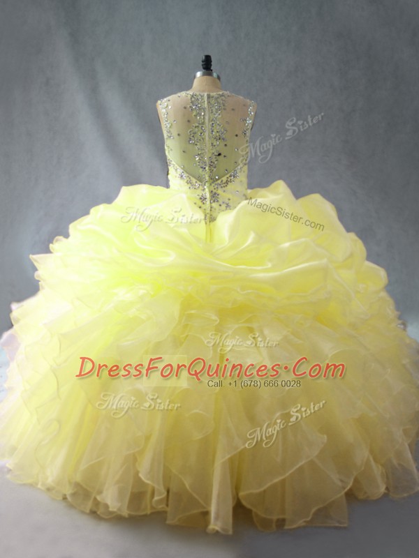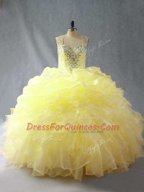 Yellow Organza Zipper 15th Birthday Dress Sleeveless Floor Length Beading and Ruffles
