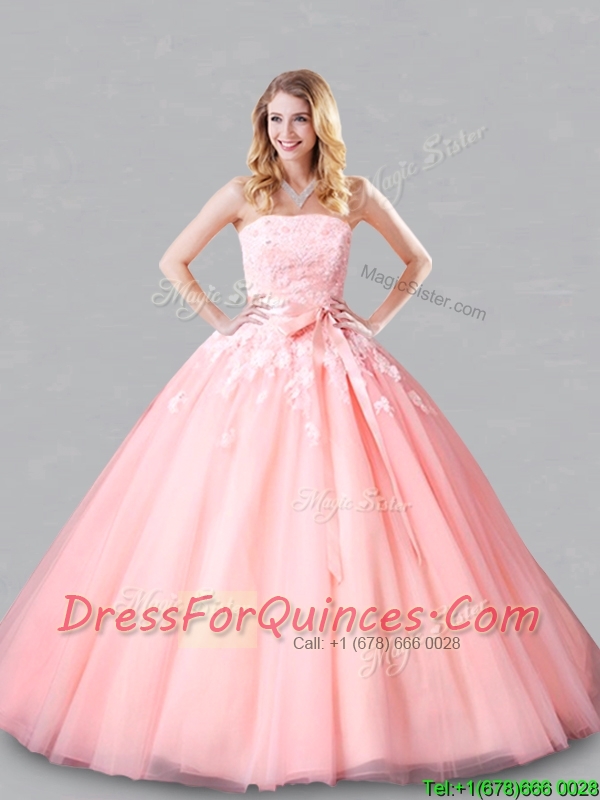 Classical Court Train Belted and Applique Sweet 16 Dress in Baby Pink