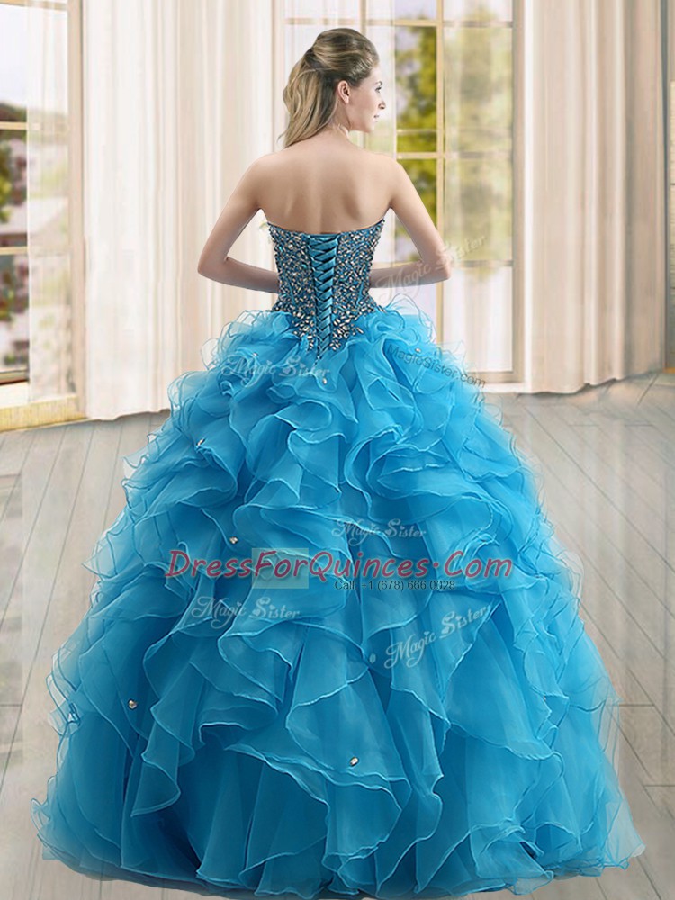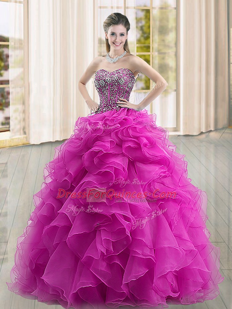Stylish Fuchsia Ball Gowns Organza Sweetheart Sleeveless Beading and Ruffles Floor Length Lace Up Sweet 16 Dresses