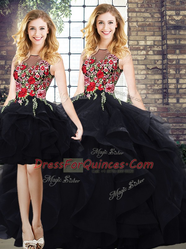 Three Pieces Sweet 16 Dress Black Bateau Tulle Sleeveless Floor Length Lace Up