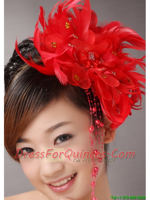 Red Custom Made Headpieces With Beaded Decorate Feather
