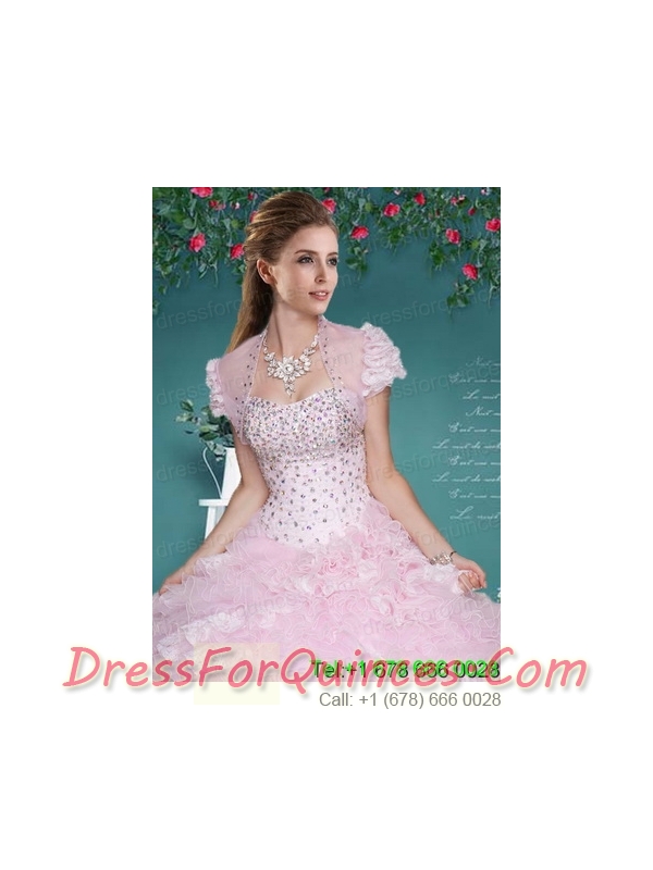 Fashionable Baby Pink Organza Quinceanera Jacket with Beading and Ruffles