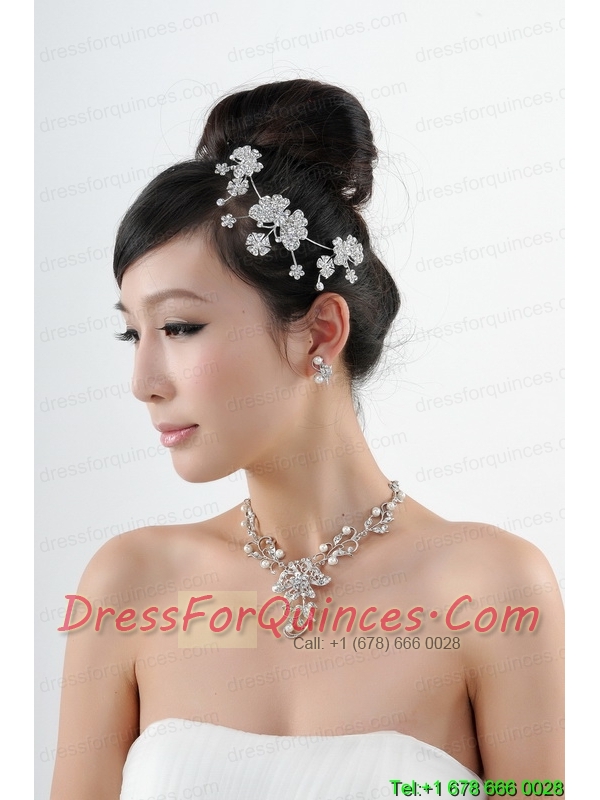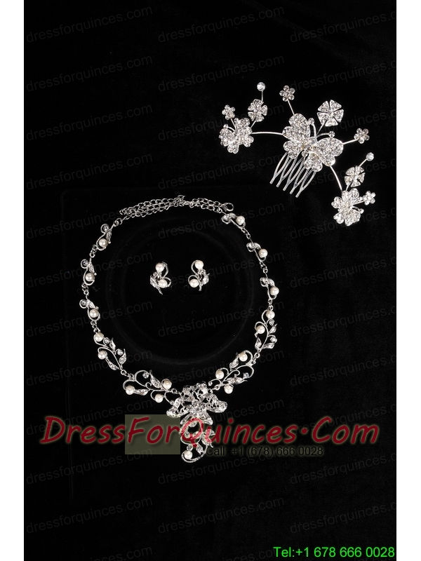 Butterfuly Rhinestone and Pearl Necklace Headpiece Wedding Jewelry Set