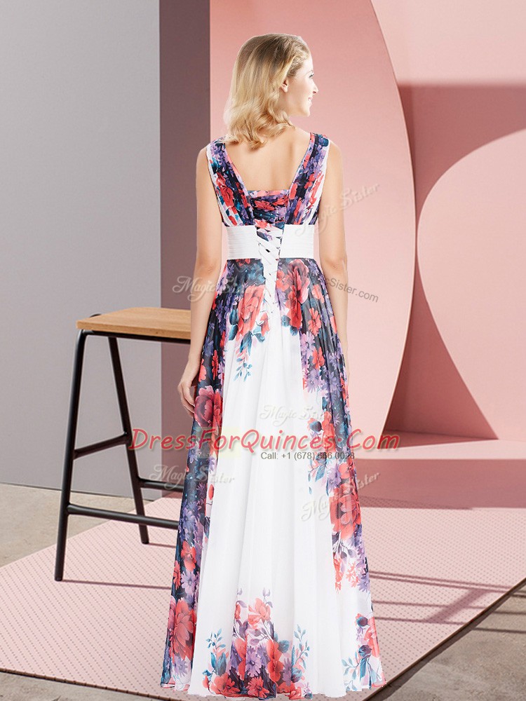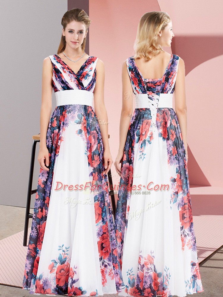 Glamorous V-neck Sleeveless Dress for Prom Floor Length Pattern White Chiffon