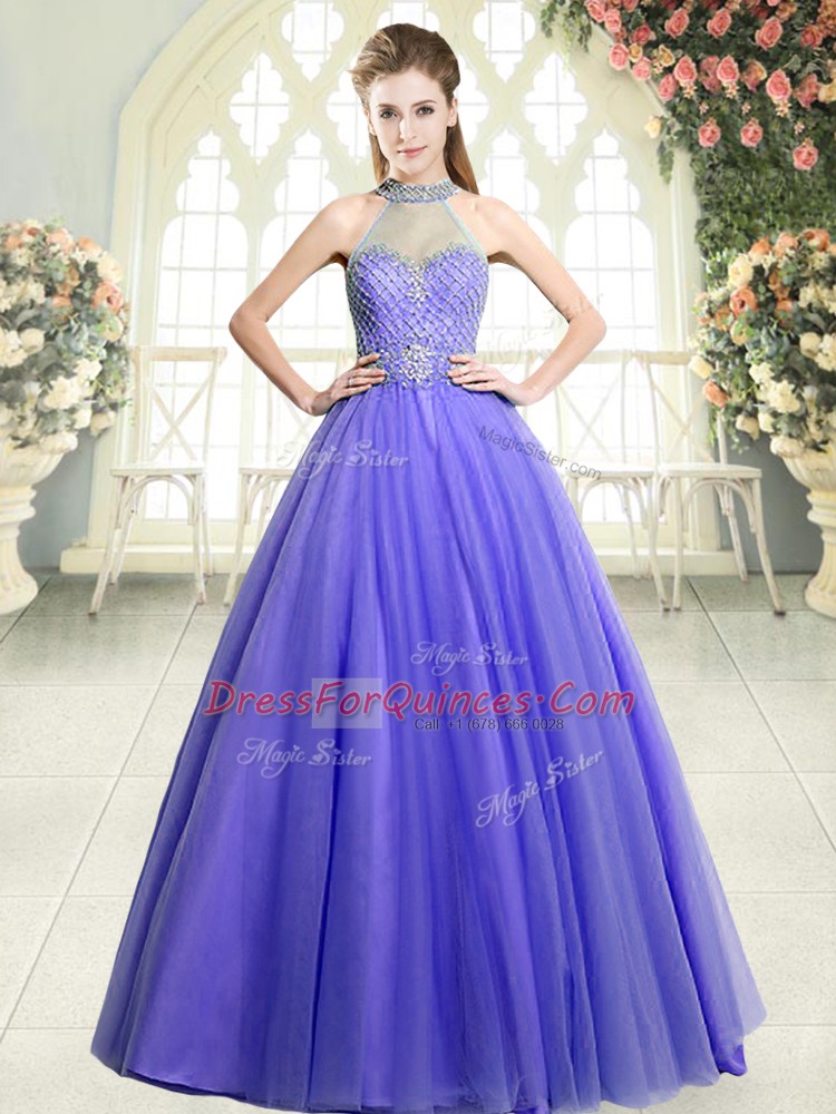 Lavender Sleeveless Floor Length Beading Zipper Prom Evening Gown