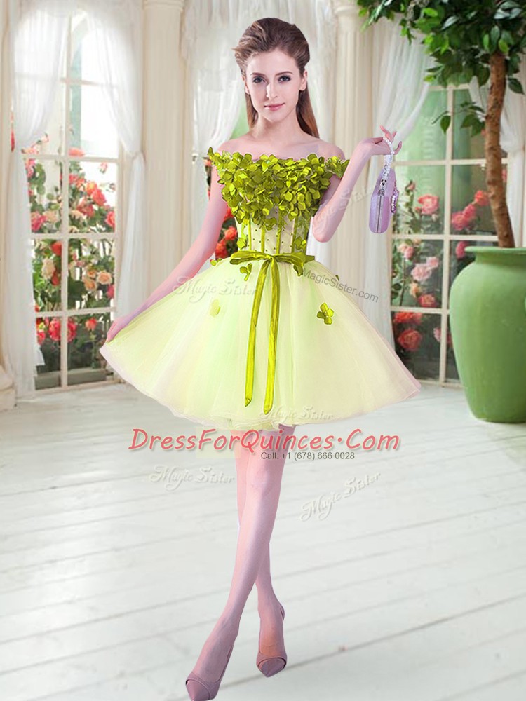 Sleeveless Tulle Mini Length Lace Up Prom Dress in Yellow Green with Beading and Appliques